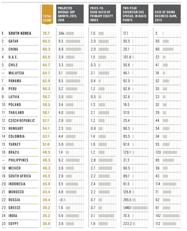 En el top 2015 de Bloomberg de los mercados emergentes más prometedores, publicado tanto en revistas angloparlantes como Bloomberg Bussines news como hispanas como el diario español “El Confidencial”, la lista la encabeza Corea del Sur (1º) seguida por Qatar (2º), China (3º), Emiratos Árabes Unidos (4º), Chile (5º), Malasia (6º), Panama (7º), Perú (8º), Latvia (9º), Polonia (10º), Thailandia (11º), Republica Checa (12º), Hungría (13º), Colombia (14º), Turquía (15º) y Brasil (16º).